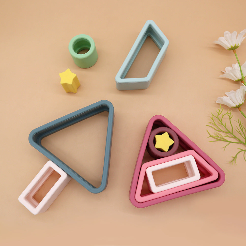Crafted from food-grade silicone, this stacking toy set is soft, durable, and safe for kids aged 3+. It comes in two color schemes—green and red—each featuring various shapes. Weighing just the right amount for little hands, it’s easy to grasp and play with.