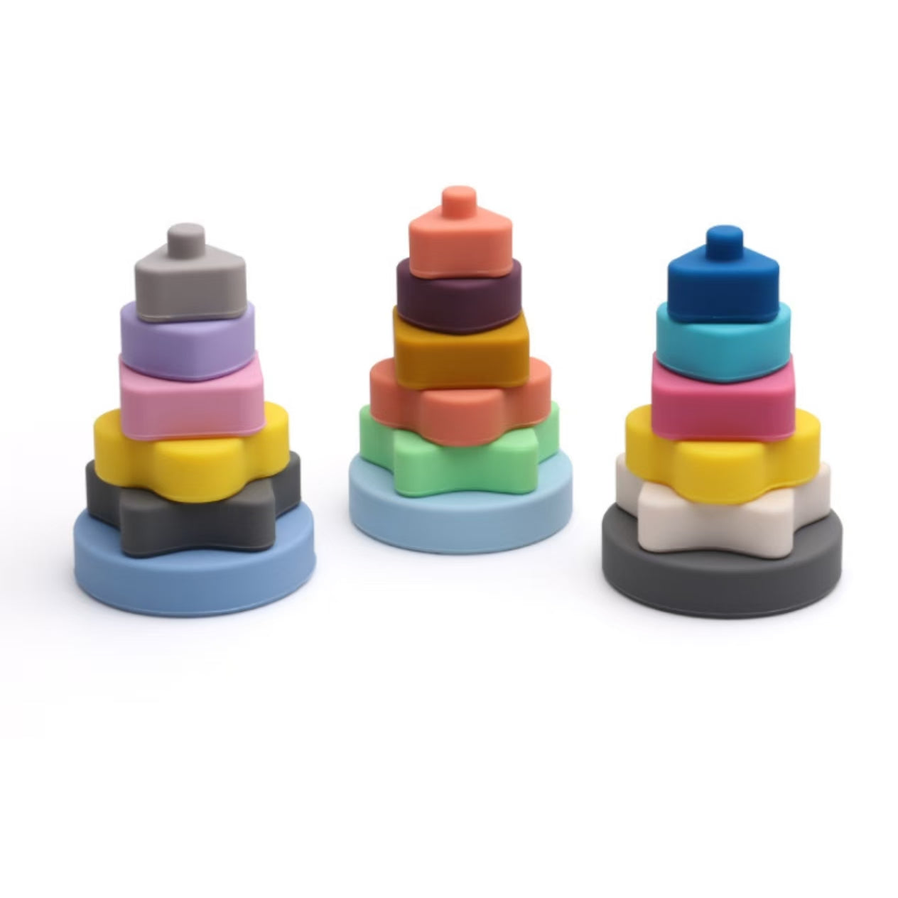 Available in three aesthetic color palettes — Blue, Grey, and Rainbow — the vibrant silicone pieces stimulate visual development while the soft texture enhances sensory exploration. Each ring’s snug fit makes stacking intuitive, encouraging babies to experiment freely without frustration.